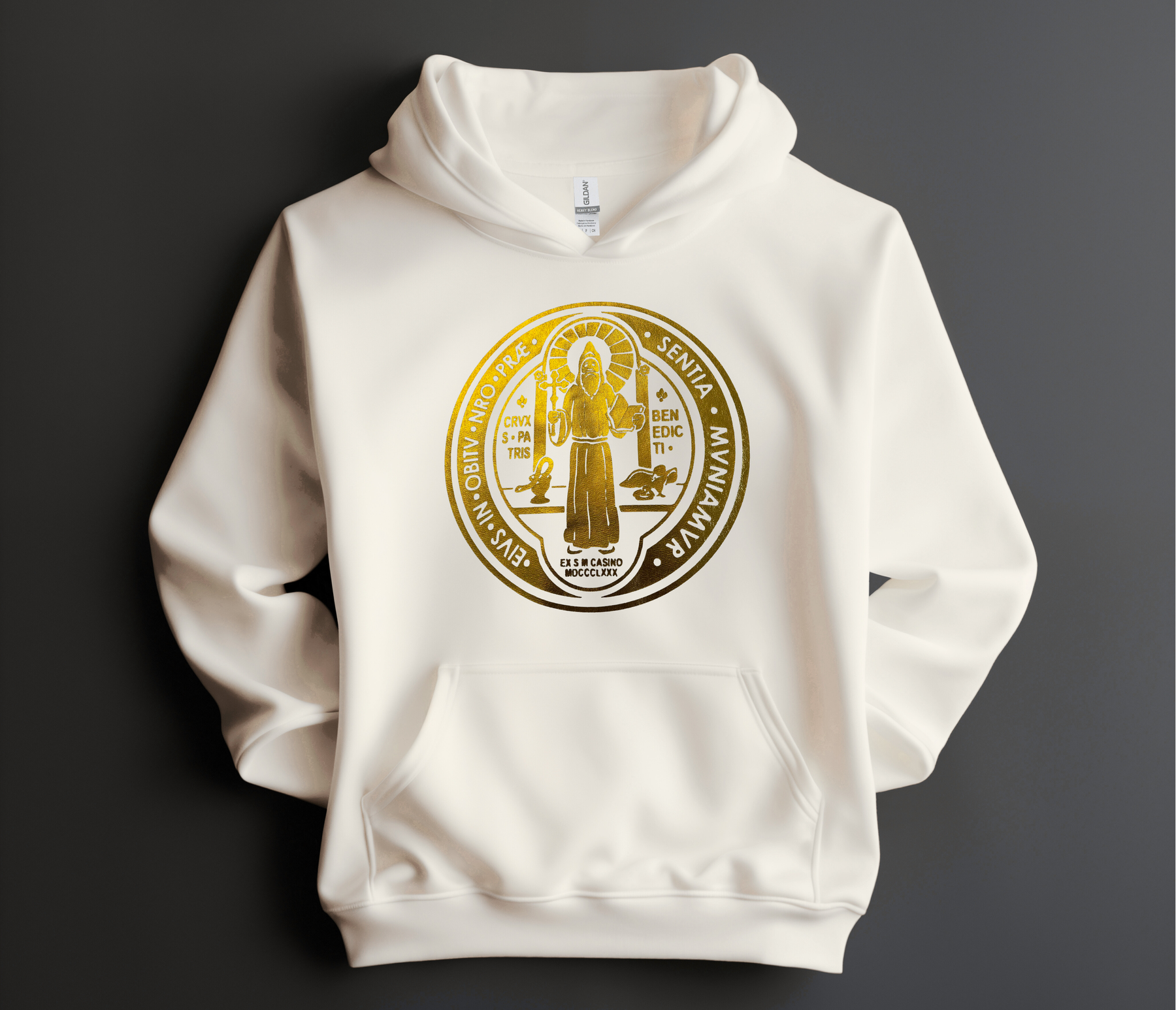 St Benedict Medal, Unisex relaxed fit, Gold foil image on Cream Hoodie.